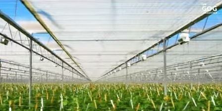 In ons streven het gasverbruik zo laag mogelijk te houden, werken we bij Van Gog Kwekerijen met dubbele energieschermen in de kas. Deze zilvergrijze doeken hangen onder elkaar, met zo’n 40 cm tussenruimte.